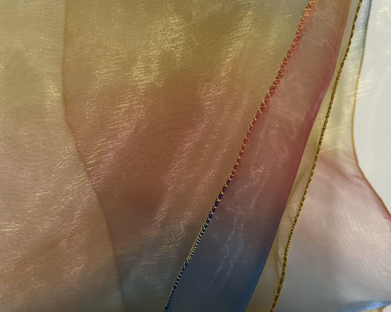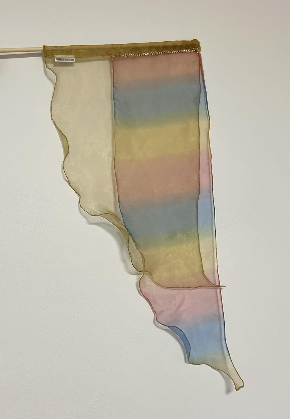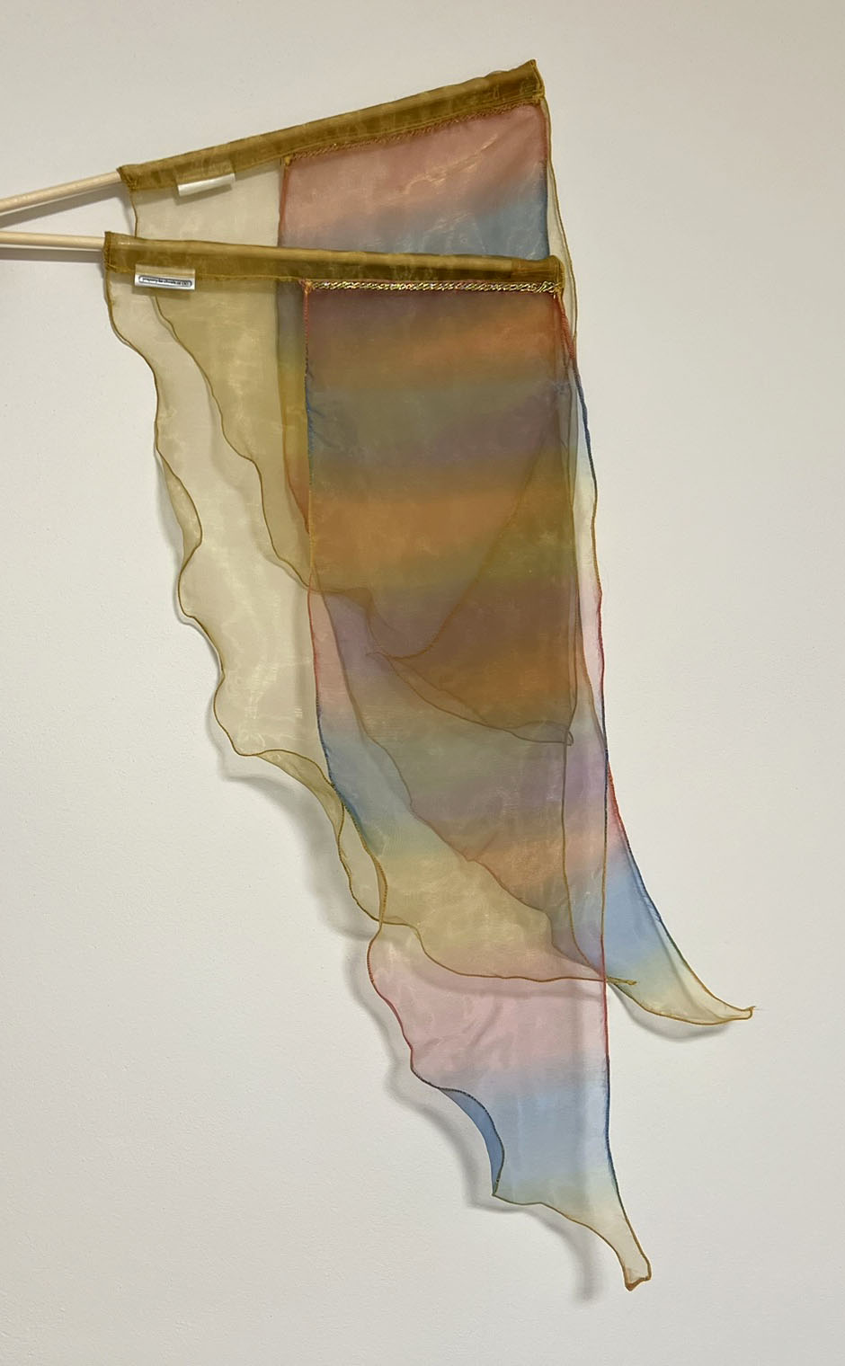 Dvojice vícevrstvých pestrobarevných praporků z průhledné látky pro radostný tanec.
