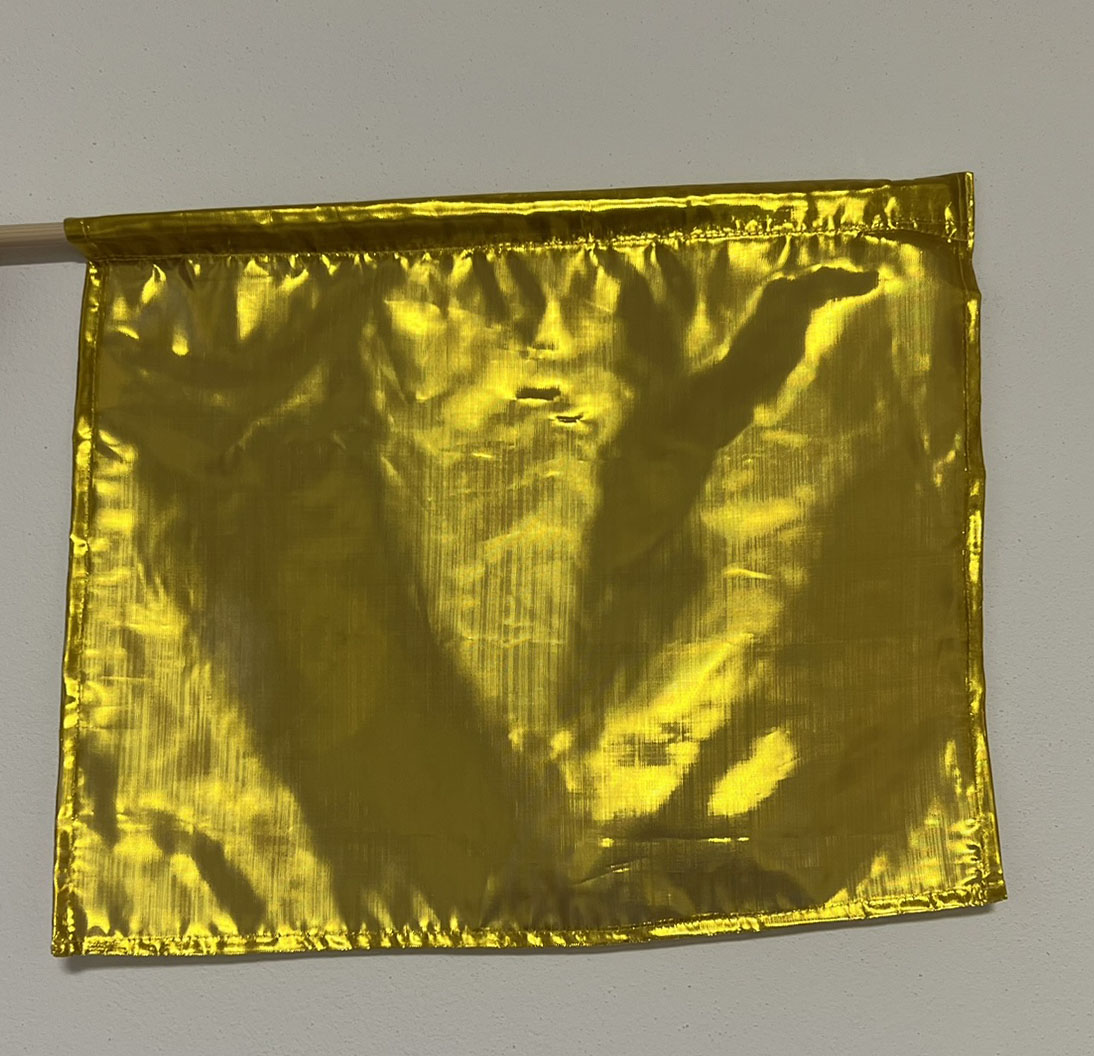 Dvojice malých zlatých praporků ze speciální lesklé látky.